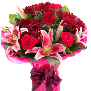 A simply stunning red Rose & pink Lily flower bouquet with deep red Spray Chrysanthemums and bold Carnation blooms.